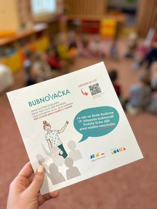 Naše mateřská škola se v letošním školním roce poprvé zapojila do celorepublikové akce s názvem „Bubnovačka“, kterou pořádá v rámci svých preventivních aktivit “Týdne za dětství bez násilí„ Centrum LOCIKA. Tato akce probíhá každoročně 19. listopadu, kdy si připomínáme Světový den prevence týrání a zneužívání dětí. Bubnování probíhalo na všech třídách, kdy děti a paní učitelky společným bubnováním ukázaly, že jim násilí na dětech není lhostejné, a že tyto preventivní akce mají smysl.