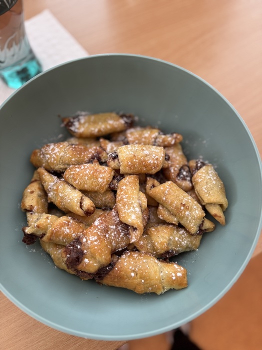 Společně jsme připravovali těsto podle obrázkového receptu. Po jeho odpočinutí si děti těsto namazaly, stočily do rohlíčků a po obědě si své voňavé a čerstvě upečené rohlíčky s chutí snědly. Moc dětem chutnaly.
